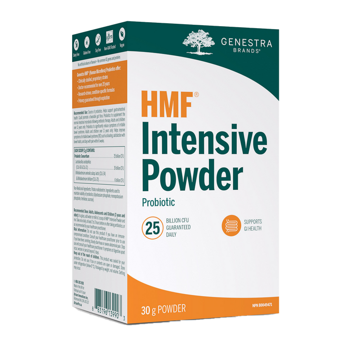 - HMF Intensive Powder Aids intestinal health in children and adults Provides live microorganisms that temporarily modify gut flora Assists Aid gastrointestinal health Provides 25 billion CFU per dose from: Lactobacillus acidophilus (CUL-60), Lactobacillus acidophilus (CUL-21), Bifidobacterium bifidum (CUL-20), Bifidobacterium animalis subsp