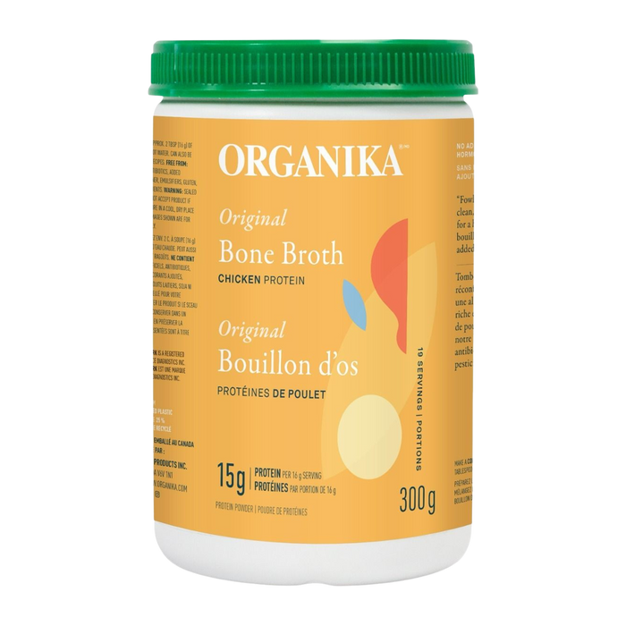 - Enter Organika’s Bone Broth powder: the answer for the busy-yet-health-conscious! This Chicken Bone Broth is simmered 24-48 hours to extract as many nutrients as possible