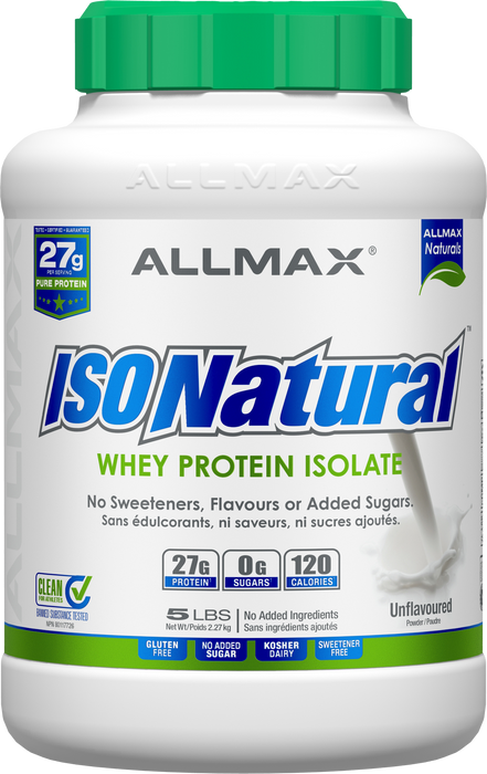 ALLMAX ISONATURAL™ Pure Whey Protein Isolate is a clean, naturally flavored protein powder delivering 27 g of pure whey protein per scoop—with absolutely zero added sugars, artificial flavors, colors, or sweeteners.