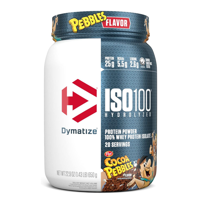 - ISO 100 Cocoa Pebbles Gluten-Free Super Fast Digesting Banned substance tested Dymatize Nutrition ISO100 Hydrolyzed Whey Protein is simply muscle-building fuel