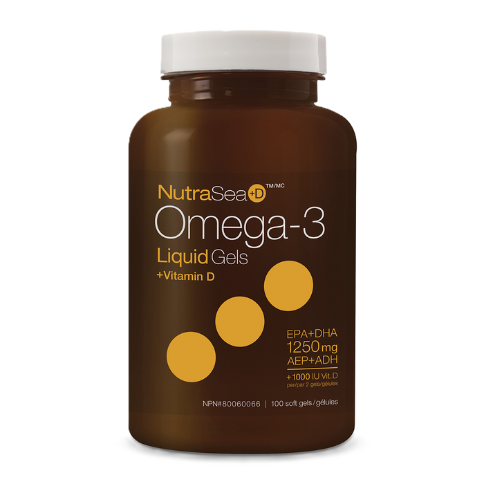 - +D Omega-3 Liquid Gels This trusted NutraSea+D Omega-3 in just two softgels a day, for the maintenance of good health; 750 mg of EPA + 500 mg DHA + 1000 IU vitamin D3 NutraSea+D premium quality omega-3 softgels have a fresh mint flavour and no fishy burp-back