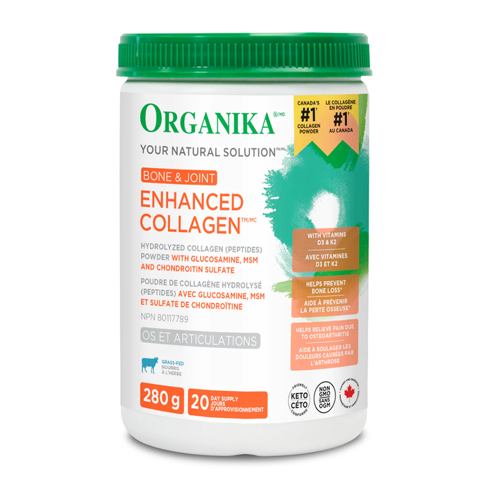 - Organika's Enhanced Collagen fortified with glucosamine, MSM, chondroitin, and other nutrients such as vitamin D3 and K2 to provide a blend that gives special attention to aching bones and joints