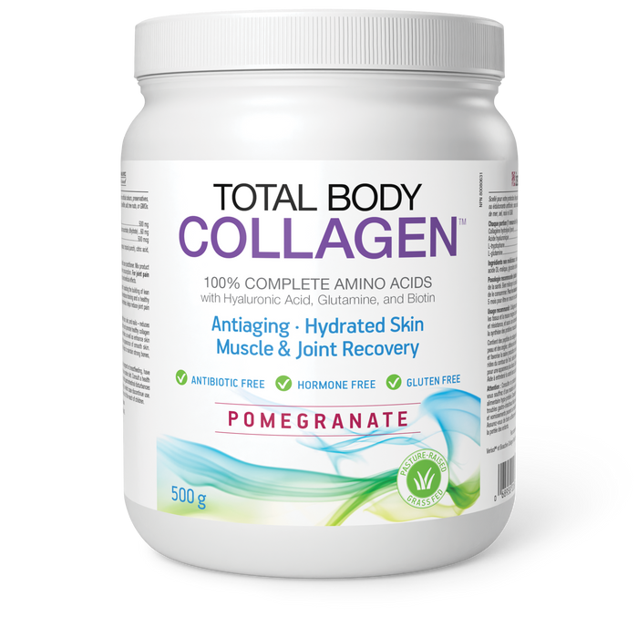 Total Body Collagen is a unique formula featuring hydrolyzed collagen, hyaluronic acid, L-tryptophan, L-glutamine, vitamin C, and biotin – essential nutrients that promote healthy skin, muscles, and connective tissue.Hydrolyzed collagen promotes collagen synthesis and has been shown to help reduce joint pain associated with osteoarthritis. Collagen and hyaluronic acid work together to provide structure, strength, and resilience in the body’s tissues, and are vital for maintaining hydration in the joints. This formula also supports muscle growth and recovery, helping physically active people to build lean muscle mass.Collagen can also help reduce visible signs of aging, such as wrinkles and fine lines, and together the nutrients in Total Body Collagen support wound healing, immune function, antioxidant activity, and nutrient metabolism, with benefits for skin, hair, and nails.Total Body Collagen contains highly digestible, non-GMO hydrolyzed collagen from pasture-raised and grass-fed cattle and clinically studied Verisol®. It comes in tablets, two great-tasting flavours and unflavoured powder to promote healthy skin, connective tissues and joints from the inside out.