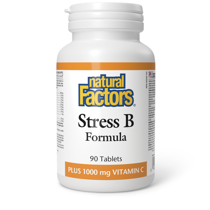 B vitamins are a group of water-soluble vitamins that help enzymes react chemically with other substances and are involved in energy production and red blood cell formation. The B vitamins help the body metabolize carbohydrates, proteins, and fats. They also help with normal growth and development, and in tissue formation.In times of physical and mental stress, the body uses up more nutrients, leading to deficiency and stress-related health problems. Nutritional support is needed for periods of stress, when the body isn’t able to adequately recover without the proper nutrients.Natural Factors Stress B Formula contains a unique blend of B vitamins to help combat the negative effects of stress. Additional lipotrophic factors choline and inositol help the body metabolize foods and convert them to energy. This formula also contains 1000 mg of vitamin C for extra support, immune function enhancement, and antioxidant support.Vitamin C is a powerful vitamin with infection-fighting properties, playing a large role in immune system function. Vitamin C is crucial for the formation of collagen, making this vitamin very important for wound repair, healthy gums, strong bones and teeth, and in the prevention of bruising.