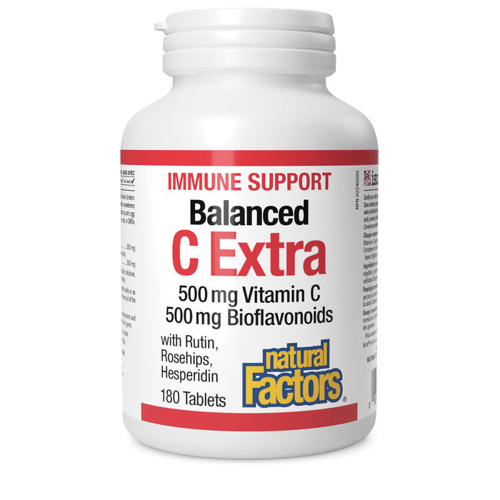 Natural Factors Balanced C Extra is an immune-support formula that combines the antioxidant benefits of vitamin C with a bioflavonoid complex for enhanced support. Vitamin C is not stored by the body and needs to be consumed daily in order to maintain the levels recommended for overall health. In addition, the body’s need for vitamin C increases during times of stress, such as intense physical activity, illness, antibiotic use, and exposure to pollutants.Vitamin C is an essential nutrient that helps in collagen formation, which is needed for the normal development and maintenance of bones, cartilage, teeth, and gums. It also helps maintain the body’s ability to metabolize nutrients. Bioflavonoids are found in many fruits, vegetables, and herbs. Bioflavonoids have been shown to improve the absorption and therapeutic action of vitamin C and protect vitamin C from oxidation in the body. Both vitamin C and bioflavonoids help protect tissues from free radical damage. Balanced C Extra contains 500 mg of vitamin C blended with citrus bioflavonoids, rutin, rosehips, and hesperidin in each tablet or easy-to-swallow capsule. It contains no preservatives, sweeteners, gluten, or GMOs, and offers a convenient formula for anyone looking for additional immune and antioxidant support.