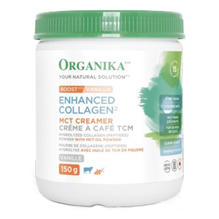- Enhanced Collagen Creamer Boost Vanilla Keto Soy Free Dairy Free Gluten Free Preservatives Free Sustainably Sourced Increase leptin levels Supports digestive health Antibiotic and hormone free Improves cognitive functions Available in Original and Vanilla Pure 100% hydrolyzed collagen Grass-fed, Pasture-raised, unflavored Non-GMO, sustainably-sourced coconuts If you are looking for a clean, functional creamer for your coffee, then this MCT creamer is the one for you! Unlike typical creamers, Enhanced Collagen Boost is made up of only 2 natural ingredients: this award-winning Enhanced Collagen peptides and a GMO-free coconut MCT oil powder (sustainably sourced from Southeast Asia)