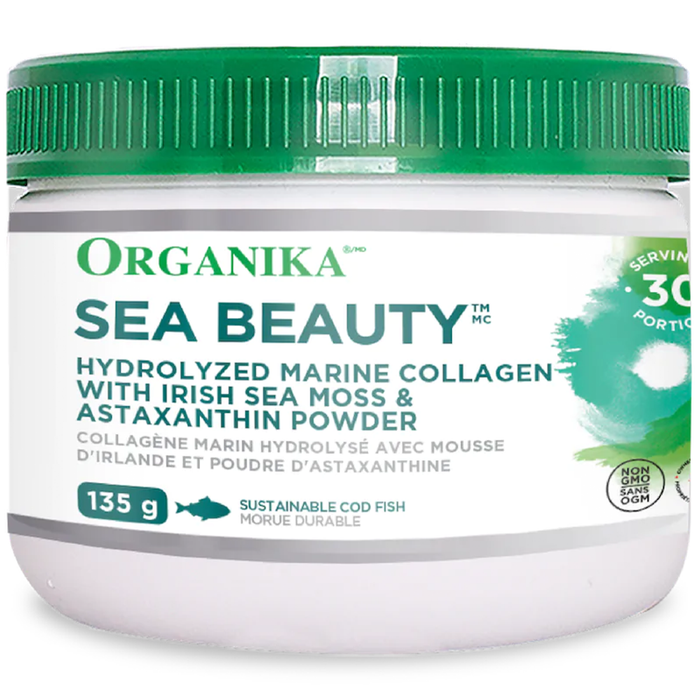 - 5 g of organic Irish Sea Moss per serving Sustainably sourced from the North Atlantic Ocean Anti-aging Aid: Preventive-Wellness-Car-e of fine lines and wrinkles Amplifying anti-aging and skin health with marine collagen + sea moss Organika’s Sea Beauty Powder contains marine collagen as well as sea moss and astaxanthin, all to maximize your beauty goals, your skin elasticity and your skin strength