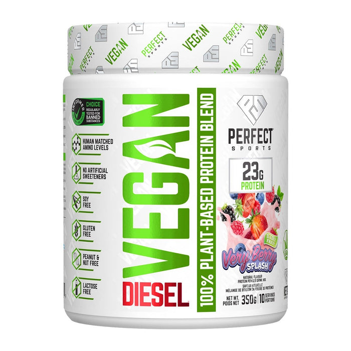 - Diesel Vegan Protein Very Berry Splash Keto Vegan Soy Free Gluten Free Lactose Free Peanut And Nut Free No Atificial Sweeteners Finally, a Plant-Based Protein that actually delivers! DIESEL Vegan provides human-matched levels of amino acids that we need from protein