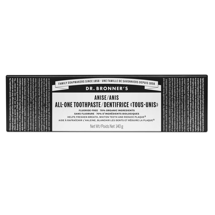 - Bronner's All-One Toothpaste with 70% organic ingredients! Our low-foaming formula has no synthetic detergent foaming agents, is fluoride-free, vegan and cruelty-free, with no artificial colors, flavors, carrageenan, preservatives, or sweeteners—none! This simple yet effective toothpaste stimulates mouth, teeth, gums and tongue, leaving them fresh and clean