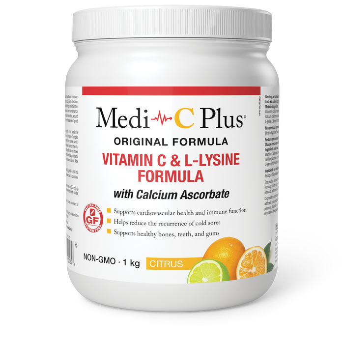 Medi-C Plus with Calcium Ascorbate provides high doses of vitamin C and L-lysine, along with calcium, to support cardiovascular health and immune function. These nutrients can also help reduce the recurrence of cold sores, provide antioxidant support, and maintain bones, teeth, and gums. Vitamin C and lysine work together to build collagen, strengthening and holding the coronary artery.